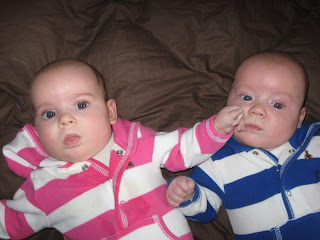 Lillie and Elliott hit the 4 month mark today (and I'm actually getting them on the blog on the exact date!) I guess things are becoming routine around here. I'm happy to say that all my children go down for a nap between 1 and 1:30 and all 3 sleep for a few hours and then Lillie and Elliott go to bed between 7 and 7:30 and Jack follows between 8 and 8:30. Now all other times of the day are still slightly unpredictable, but each day we are getting a little closer to a routine. If only Lillie and Elliott would sleep all the way through the night. They are sleeping about 8 hours straight, usually waking up between 3 and 4. I'm sure some of you are thinking... if they can sleep 8 hours then why not keep them up a little longer then put them to bed. We've tried! It doesn't matter, they wake up at 3 or 4. So hopefully next month I can report differently.
